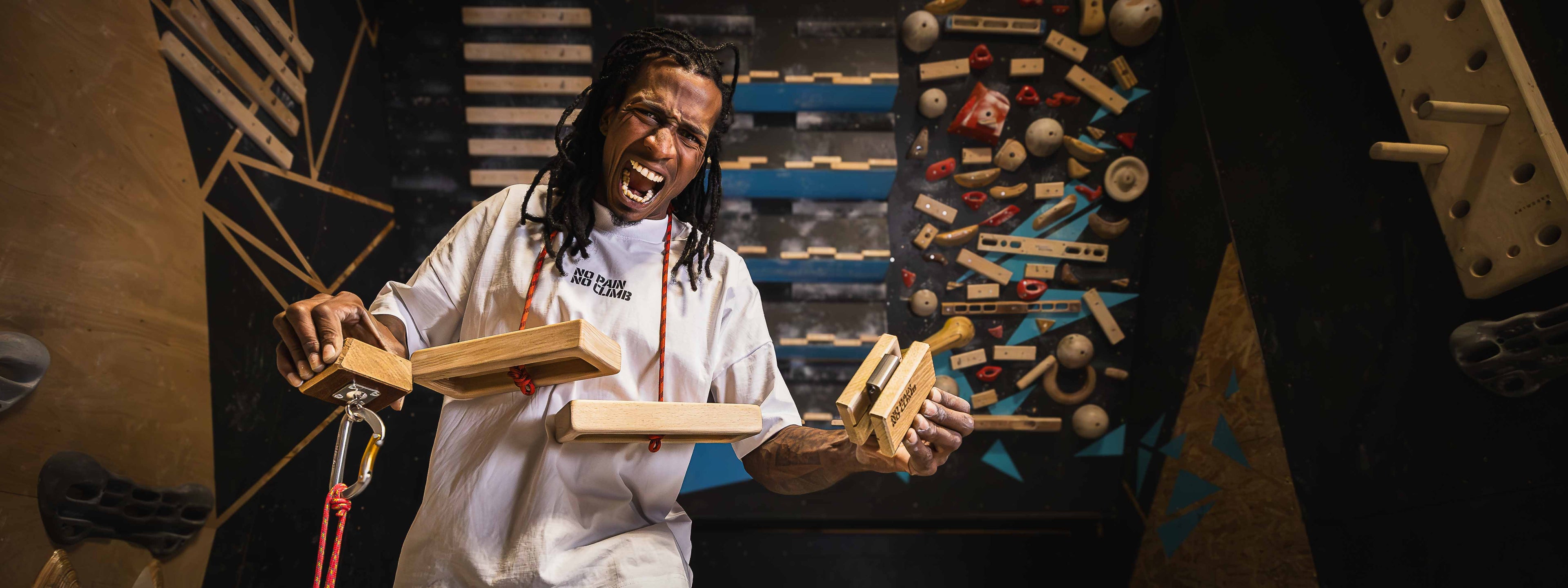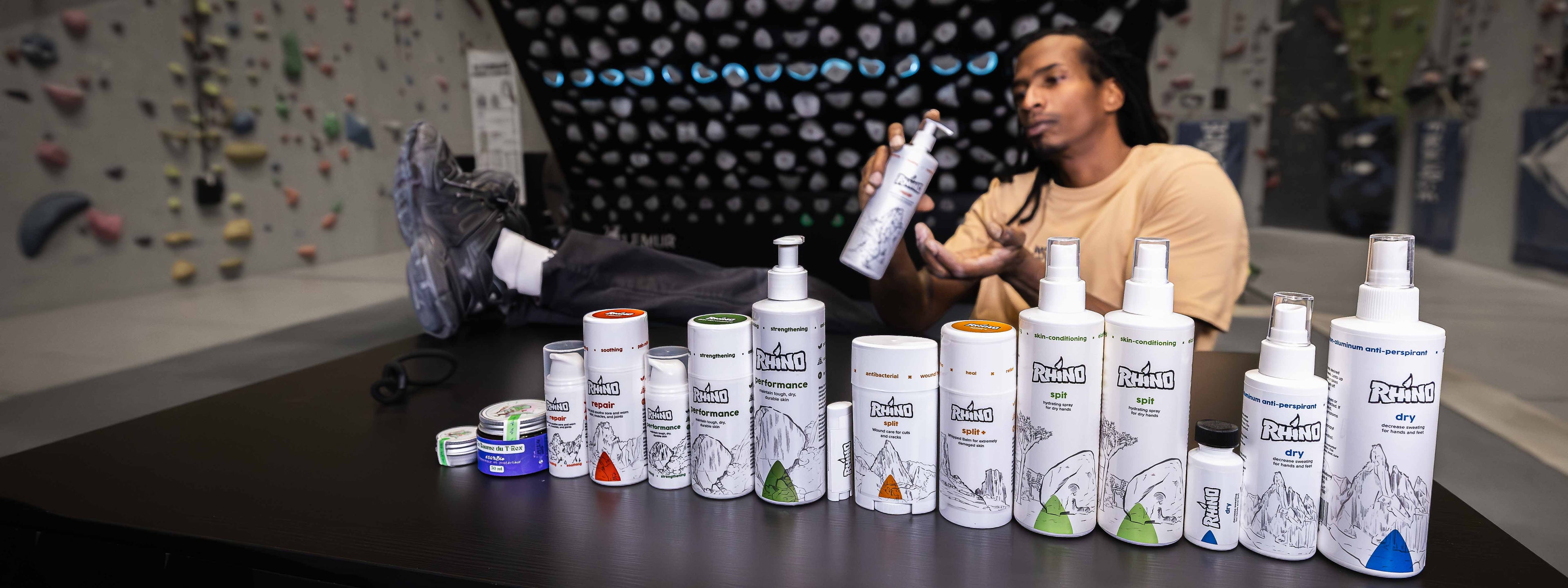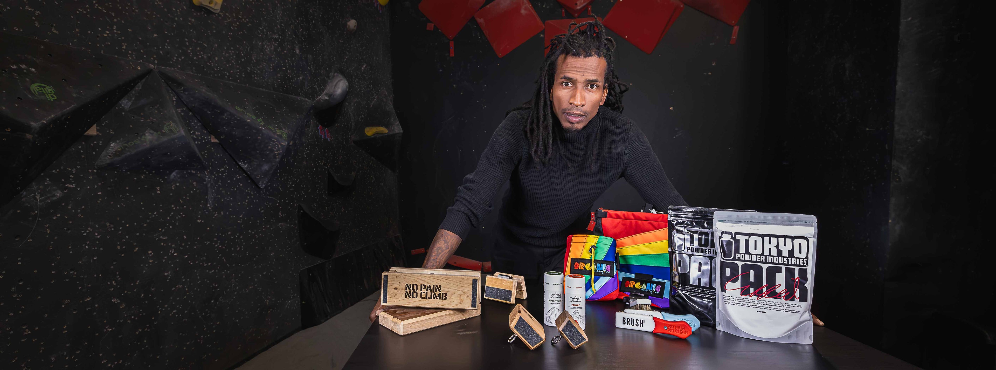 Training tools to get stronger, No Pain No Climb t-shirts, climbing games, Rhino skincare, Tokyo Powder chalk...