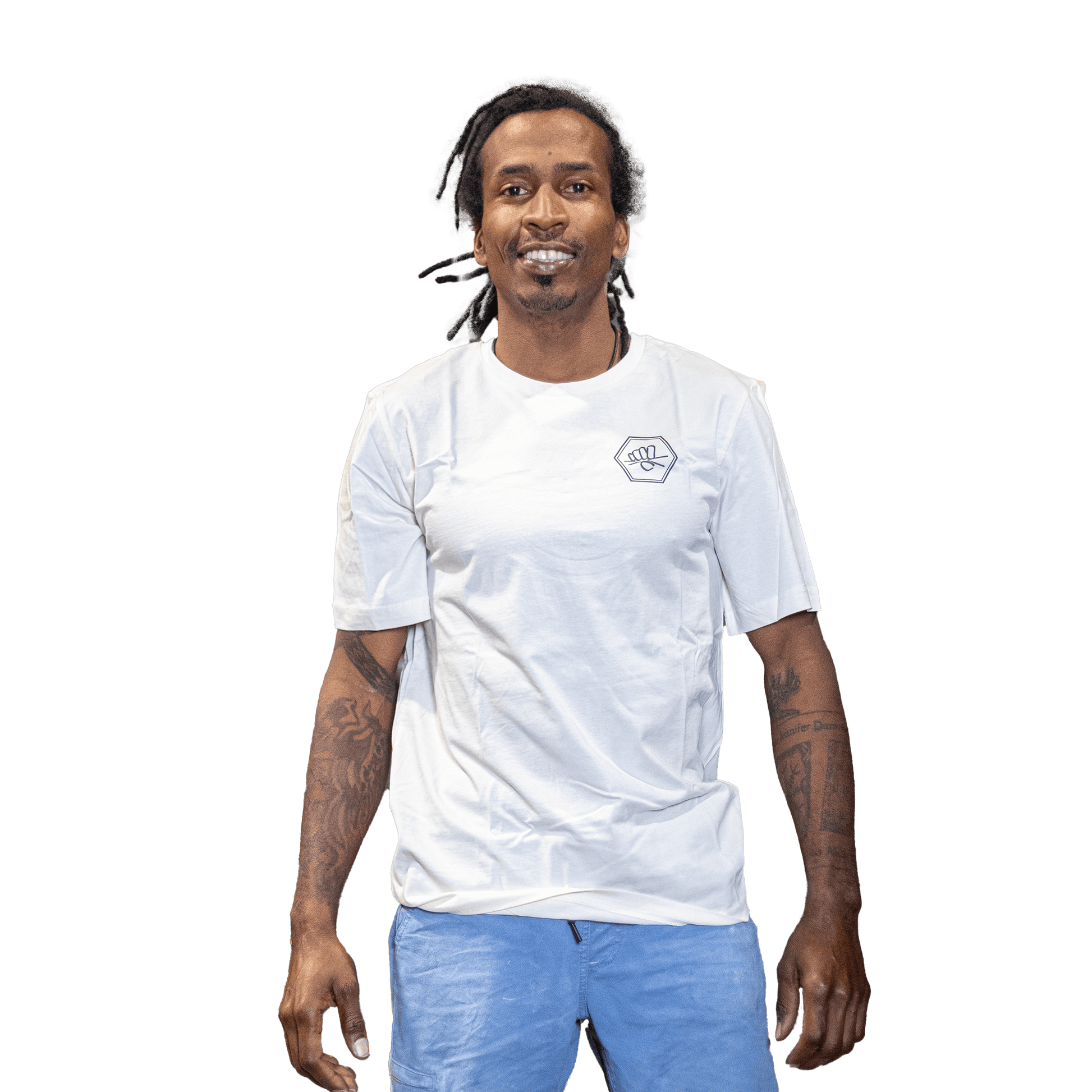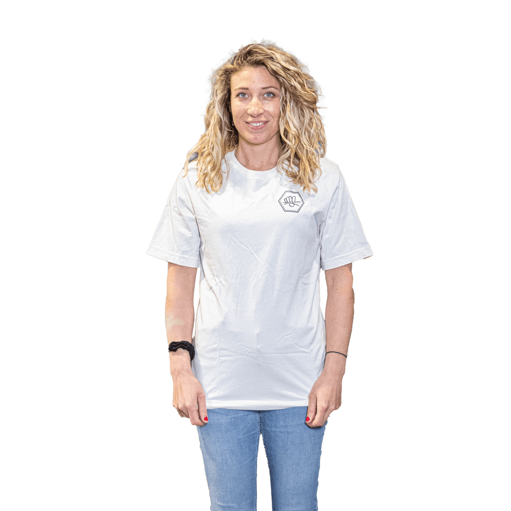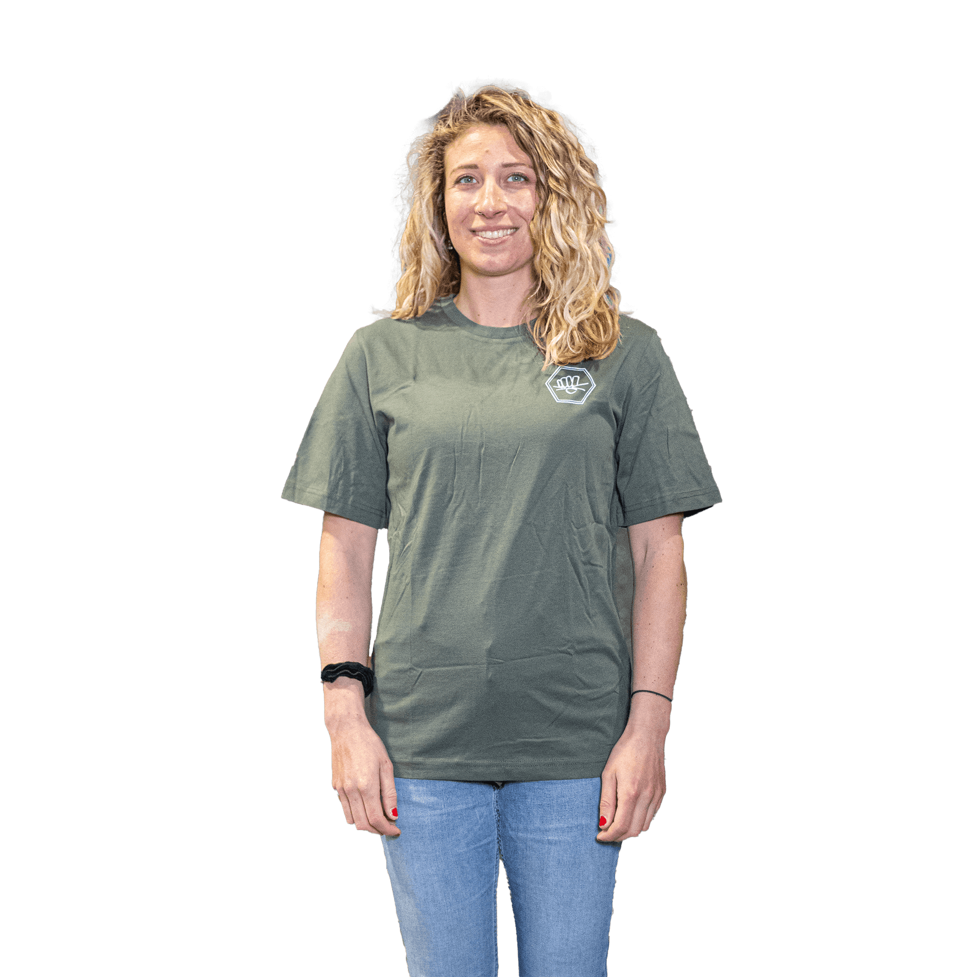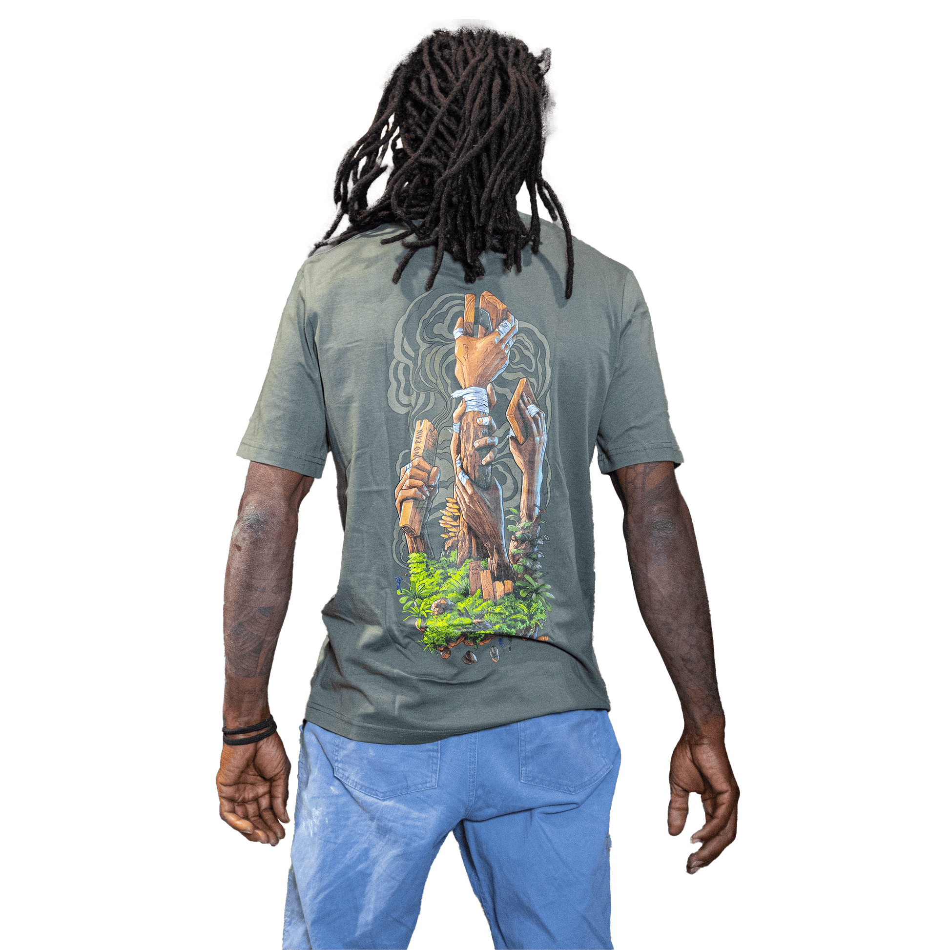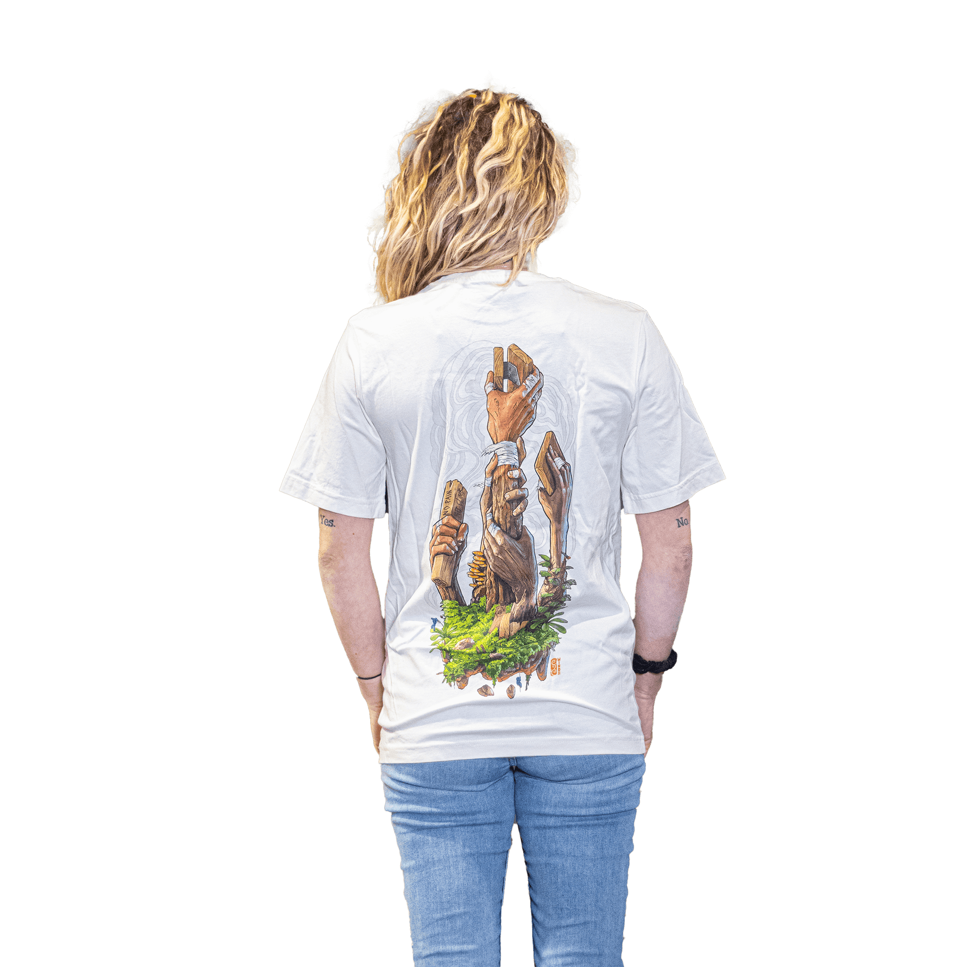 This t-shirt is the result of a collaboration between CrushClub Climbing and No Pain No Climb, bringing together both ideologies in a cohesive design. The wooden hands and natural elements represent the circularity of our process, the damaged hands glued together symbolize the difficulty and pain you must endure to progress in climbing, and the sense of community we all cherish in the climbing sport is represented by the hands.